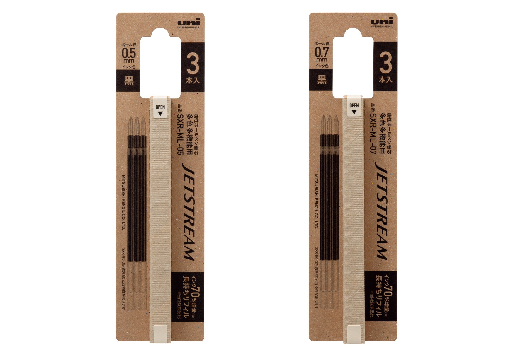 ジェットストリームインクが入った「長持ちリフィル」は、リフィルのチューブを薄くすることにより当社通常品(SXR-80)と同じ形状で互換性を保ったまま通常品比較で約70%のインク増量に成功しております。チューブが薄くなることで、プラスチック使用量も通常品に比べ約30%減量、加えてパッケージには、紙製パッケージを使用した商品となっています。