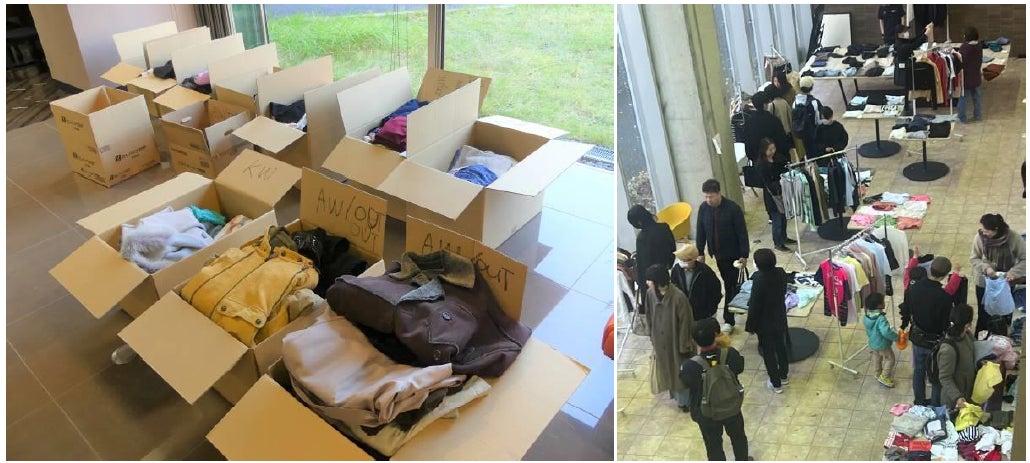 回収された衣類は、11月24日(金)~26日(日)に行われた京都工芸繊維大学の大学祭「松ヶ崎祭」にて、無償配布を同サークルが行いました。3日間の来場は1,500名程あり、学生を始め近隣住民の間にて多くの古着が循環されました。