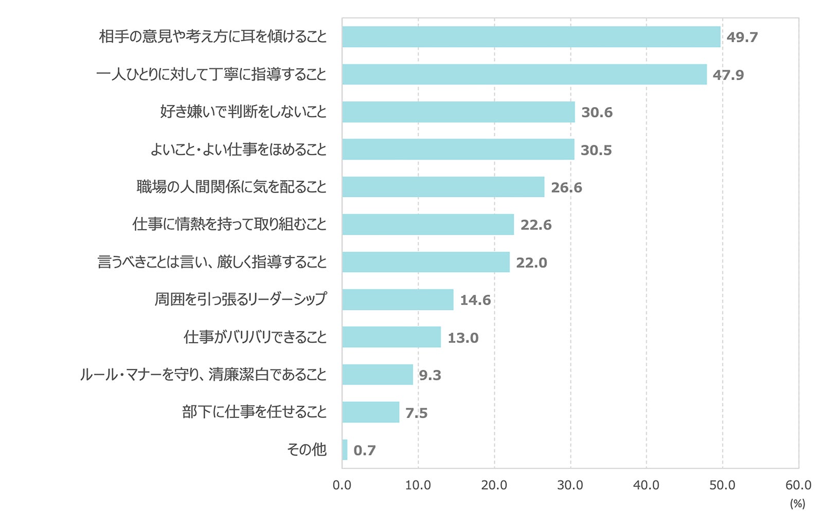 トップ2は「相手の意見や考え方に耳を傾けること」 (49.7%)、「一人ひとりに対して丁寧に指導すること」(47.9%)