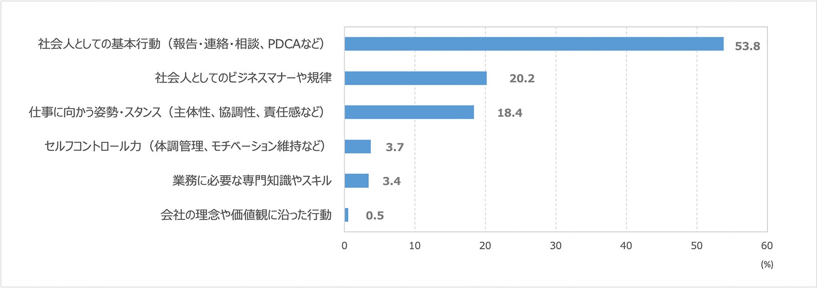 トップは「社会人としての基本行動(報告・連絡・相談、PDCAなど)」(53.8%)、最下位は「会社の理念や価値観に沿った行動」(0.5%)となり、これまでと比べて傾向に大きな違いは見られなかった