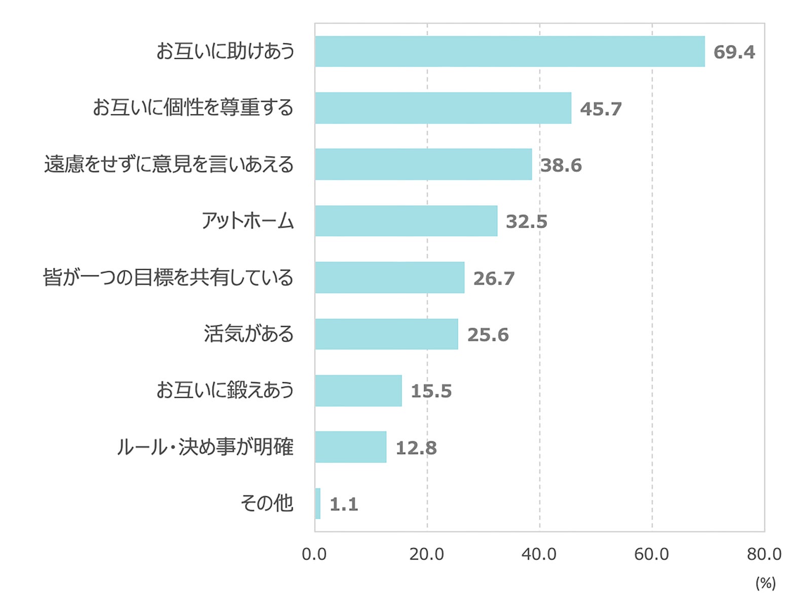 トップは「お互いに助けあう」(69.4%)で、「アットホーム」(32.5%)は中位だが過去最低となった