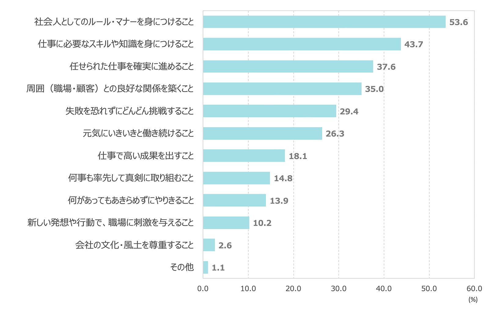 トップは「社会人としてのルール・マナーを身につけること」(53.6%)で2010年からの調査実施以来の過去最高値