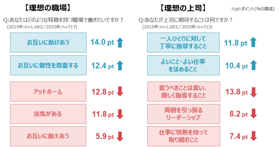理想の職場は、「活気があって鍛えあう職場」から「個性を尊重しながら助けあう職場」へ。理想の上司は、「情熱を持って厳しく引っ張る上司」から「よいことをほめながら丁寧に指導する上司」を志向する傾向にあることが読み取れる
