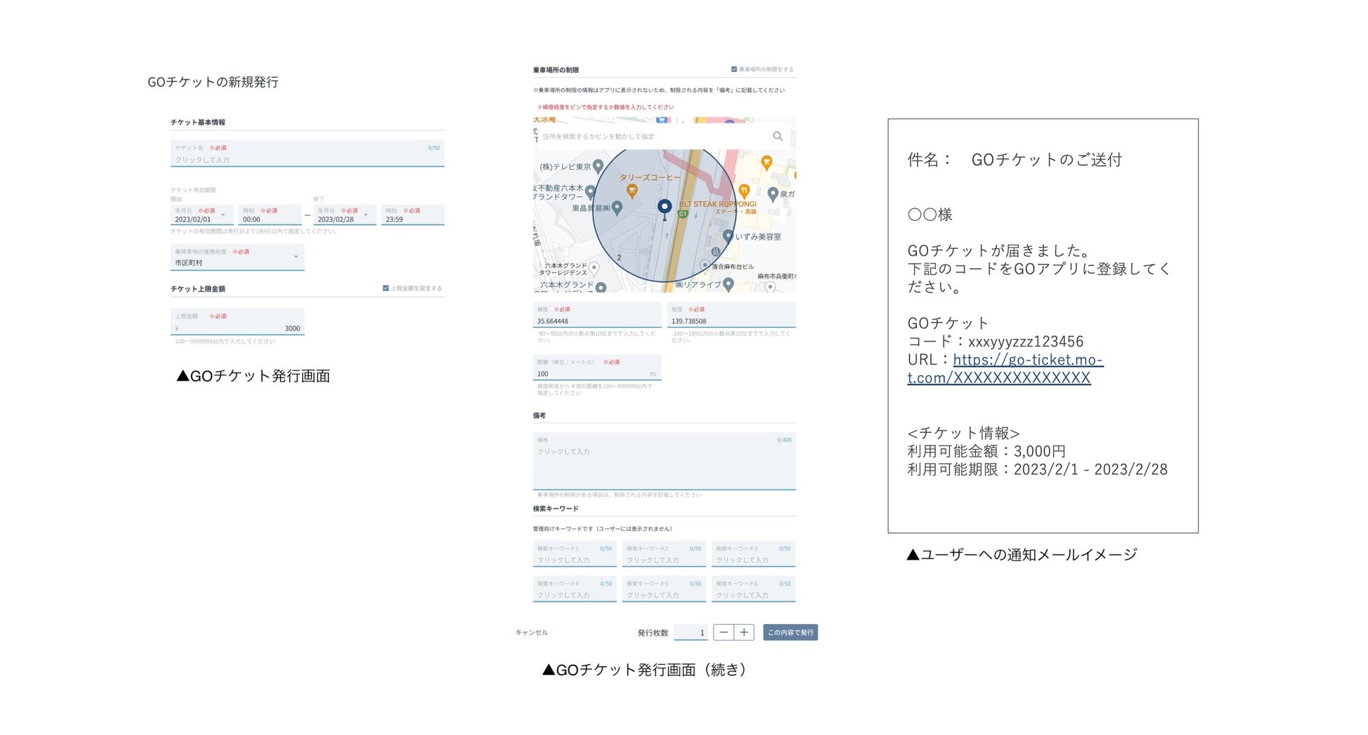 - ご利用方法 : 『GO BUSINESS』管理画面から「GOチケット」の発行・管理が可能。 発行された「GOチケット」の利用方法は以下の通り。