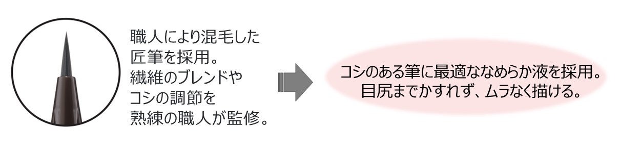 描きやすさの秘密は、新容器の後方部分に入れた「金属ウェイト」。おもりが持ち手を安定させるため、目幅を拡張する目尻ラインもテクニックいらずでブレずに描けます。