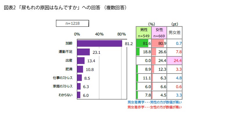 尿もれの原因については(図表2)、「加齢」が81.2%とダントツ、これに「運動不足」23.1%が続きます。ここまでは男女共通ですが、3位は男性「仕事のストレス」、女性「出産」と分かれました。図表1の表で、女性のうち “出産経験あり” の人の尿もれ経験率は43.6%と、“経験なし” より22.8ポイントも高いことからも、出産と尿もれには相関性がありそうです。