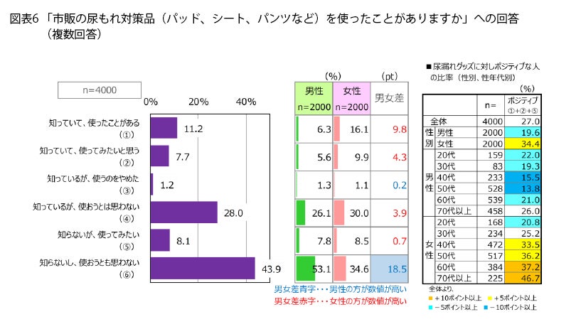 尿もれの対策として、市販の尿もれパッド・シート、防水パンツなどを使用する方法もあります。ですが、そもそもこうした対策品を知らない人や、「かっこ悪い」「そこまで深刻ではない」などの理由で使うのをためらう人も一定数いると思われます。そこで、尿もれ対策品の認知度と使用経験をたずねた結果が図表6です(尿もれ経験がない人も、自分が尿もれをした場合を想定して回答)。最も多かったのが「知らないし、使おうとも思わない」43.9%、次いで「知っているが、使おうとは思わない」28.0%で、対策品の認知の如何にかかわらず「使わない」という人が7割を占めるというのは、意外と多い印象です。一方で、認知の如何を問わずに対策品を「使ったことがある」や「使ってみたい」と “ポジティブ” な意向を示している人は27.0%に。男女別では男性19.6% vs 女性34.4%と、女性が14.8ポイント上回っています。特に、女性40代以降は軒並み3割を超え、70代以上では46.7%と半数近くに。衛生用品を使う機会が多い女性は、男性と比べて尿もれ対策品を使うことに抵抗感が少ないのかもしれません。