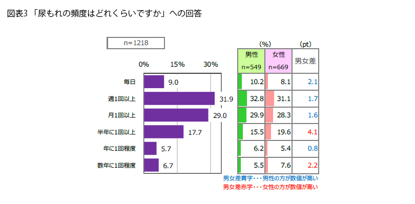 次に、尿もれの頻度をたずねてみました(図表3)。最多は31.9%の「週1回以上」、これに「月1回以上」29.0%が続き、「毎日」という人も9.0%いました。尿もれ経験者の7割が月に1回以上 “ちょいモレ” していることになり、悩んでいる人は意外に多いのかもしれません。男女別では、月に1回以上の合計は男性72.9%に対して女性67.5%と、頻度としては男性のほうが多い傾向があるようです。