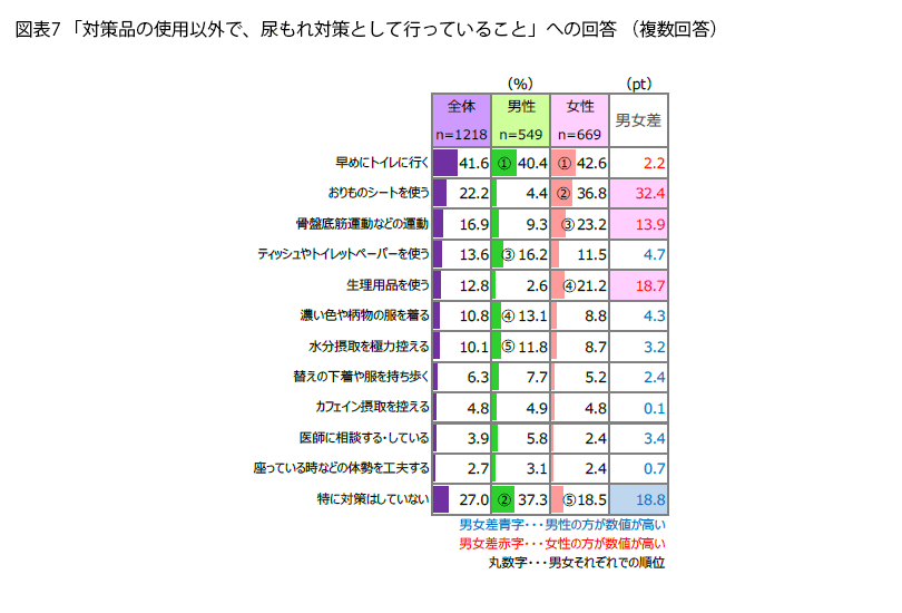 ここでも男女差が鮮明に。女性は全体のランキングに近く、おりものシートや生理用品を使う人が多いのは納得ですね。また性差がないはずの「骨盤底筋運動などの運動」が男性と13.9ポイントの差がつきました。女性は出産に伴って骨盤底筋が緩んでしまうということもあり、特に気にして運動をする人が多いのかもしれません。また男性では、「早めにトイレに行く」に次いで多かったのが「特に対策はしていない」37.3%と、女性より18.8ポイント高いのが目を引きます。女性は事前の対策を怠らないようですが、男性の3分の1が尿もれを気にしながら対策をしないというのは興味深いですね。