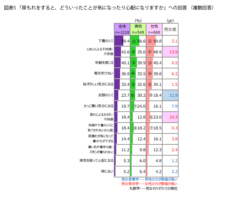 男女別では、1~5位は男女とも同じ項目が顔をそろえていますが、気になり度には差が。女性2位・男性3位の「においによる不快感・不安感」と同6位・9位の「蒸れによるかぶれ・不快感」が各13.9ポイント・10.3ポイント差で女性が高値に。女性は不快・不安といった身体的な感覚面や衛生面が気になる傾向があるようです。一方で男性が11.9ポイント上回ったのが「衣服のシミ」。図表4でトイレ関連のタイミングでの尿もれが多い傾向があることから、トイレで “失敗” したときに服にシミができてしまうことが多いからかもしれません。「かっこ悪い気分になる」も7.9ポイント男性が上回るなど、男性は周囲の目が気になりがちなようです。