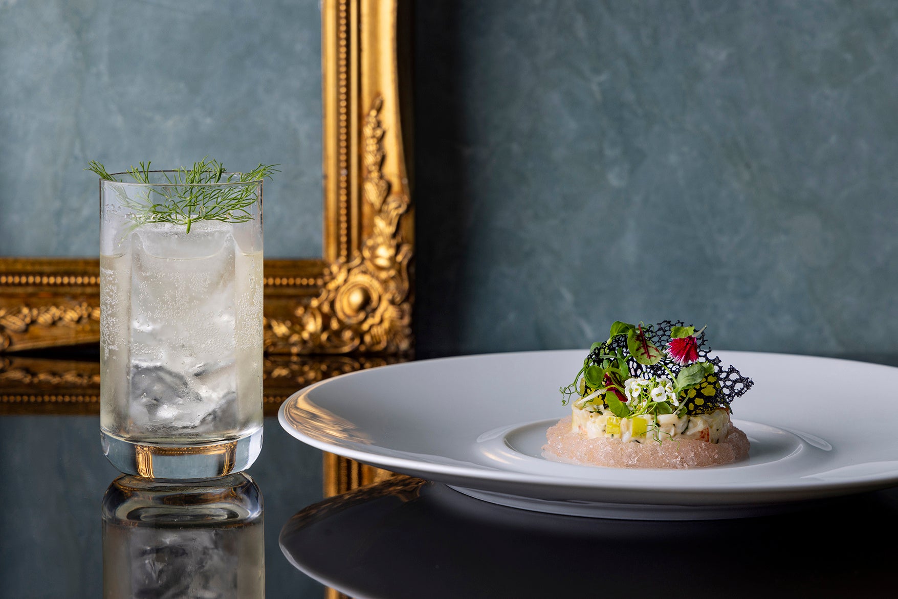 <ペアリングのポイント>庭園をイメージしマイクロハーブやロゼバルサミコのジュレを使用した前菜には、清涼感のあるすっきりとしたカクテルを合わせて。米焼酎にベルガモットやトンカ豆の香りを加えることで、爽やかでありながら上品な甘さが香る奥行きのある味わいに仕上げました。