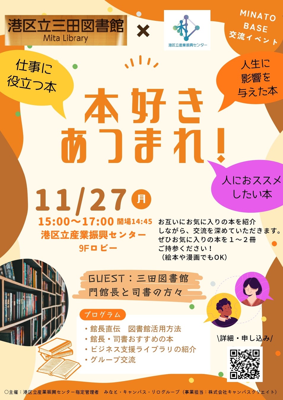 【Minato Base 交流イベント】本好き集まれ!〜仕事に役立つ本、人生に影響を与えた本など、人におススメしたい本を紹介ください〜