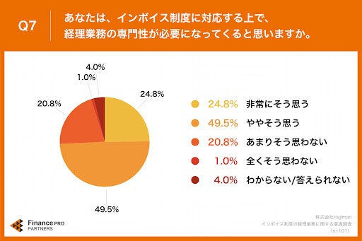 「Q7.あなたは、インボイス制度に対応する上で、経理業務の専門性が必要になってくると思いますか。」(n=101)と質問したところ、「非常にそう思う」が24.8%、「ややそう思う」が49.5%という回答となりました。