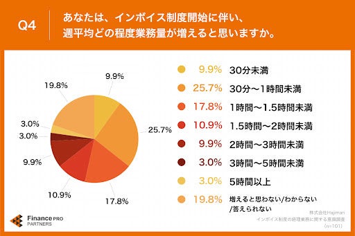 「Q4.あなたは、インボイス制度開始に伴い、週平均どの程度業務量が増えると思いますか。」(n=101)と質問したところ、「30分~1時間未満」が25.7%、「1時間〜1.5時間未満」が17.8%という回答となりました。