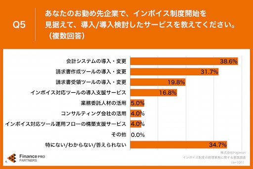 「Q5.あなたのお勤め先企業で、インボイス制度開始を見据えて、導入/導入検討したサービスを教えてください。(複数回答)」(n=101)と質問したところ、「会計システムの導入・変更」が38.6%、「請求書作成ツールの導入・変更」が31.7%、「請求書受領ツールの導入・変更」が19.8%という回答となりました。