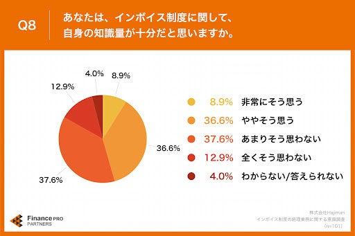 「Q8.あなたは、インボイス制度に関して、自身の知識量が十分だと思いますか。」(n=101)と質問したところ、「あまりそう思わない」が37.6%、「全くそう思わない」が12.9%という回答となりました。