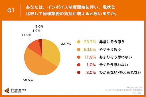 「Q1.あなたは、インボイス制度開始に伴い、現状と比較して経理業務の負担が増えると思いますか。」(n=101)と質問したところ、「非常にそう思う」が33.7%、「ややそう思う」が50.5%という回答となりました。