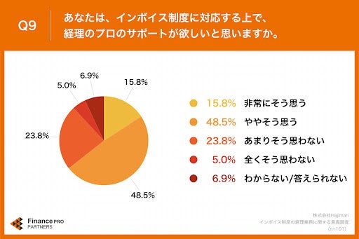 「Q9.あなたは、インボイス制度に対応する上で、経理のプロのサポートが欲しいと思いますか。」(n=101)と質問したところ、「非常にそう思う」が15.8%、「ややそう思う」が48.5%という回答となりました。
