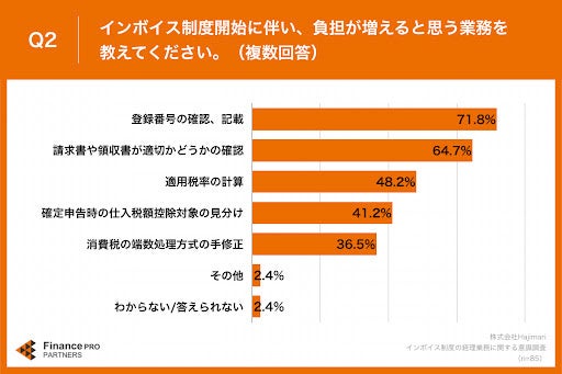 Q1で「非常にそう思う」「ややそう思う」と回答した方に、「Q2.インボイス制度開始に伴い、負担が増えると思う業務を教えてください。(複数回答)」(n=85)と質問したところ、「登録番号の確認、記載」が71.8%、「請求書や領収書が適格かどうかの確認」が64.7%、「適用税率の計算」が48.2%という回答となりました。
