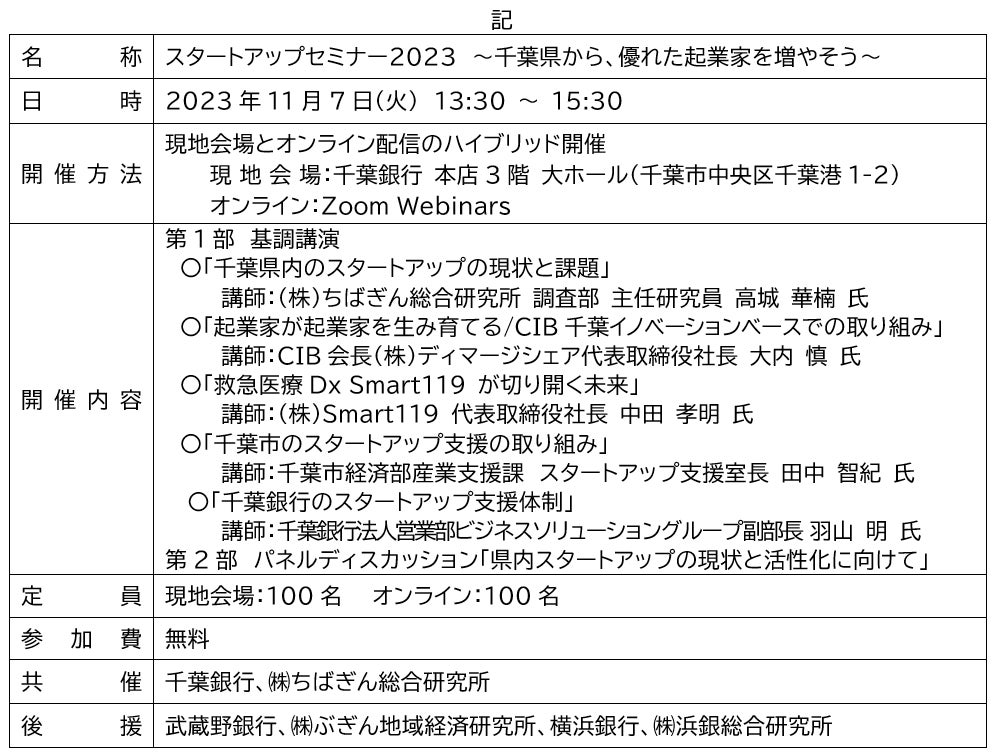 千葉銀行(頭取 米本 努)は、2023年11月7日(火)、グループの株式会社ちばぎん総合研究所(取締役社長 前田 栄治)とともに、自治体および企業の職員を対象とした「スタートアップセミナー2023」を、下記の通り開催します。