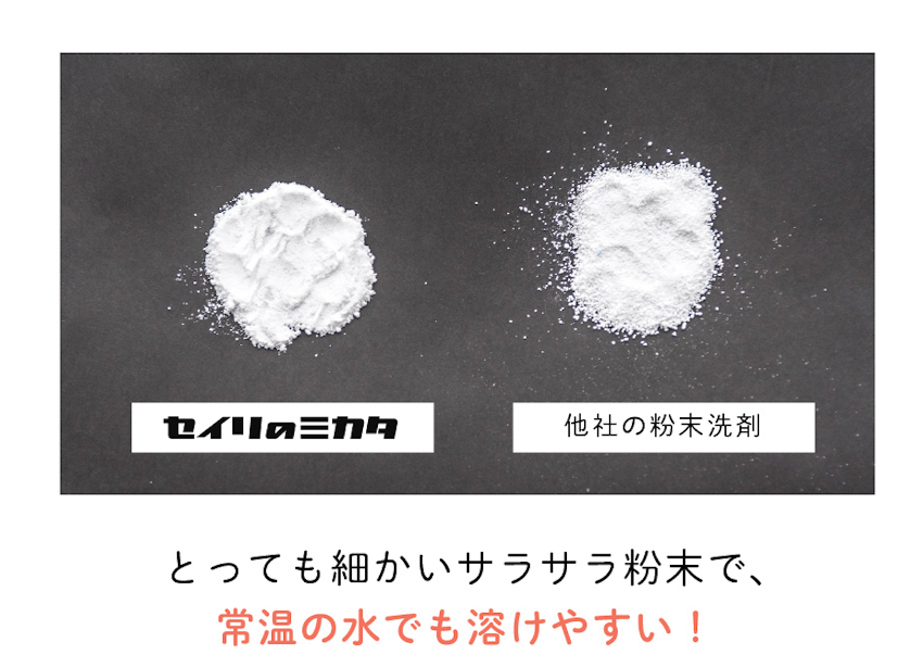 血液にはたんぱく質が含まれており、洗濯の際にお湯を使用すると凝固してシミが落ちにくくなるため、冬でも30℃以下の水~ぬるま湯を使う必要があります。また血液汚れのシミは時間が経過すると酸化して落ちにくくなり、お気に入りの下着にシミが残ってしまう原因となります。「セイリのミカタ 経血用洗剤」は、細かな粉末状のため水に溶けやすく、酵素がたんぱく質を分解してくれるため、つけおきでも汚れをしっかりと落とすことができます。