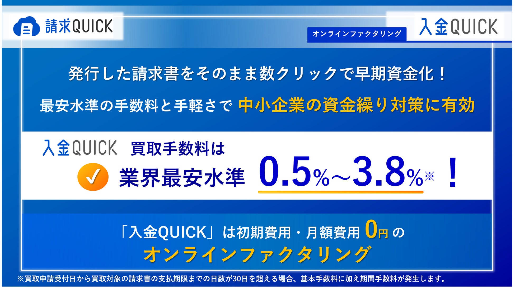 オンラインファクタリング「入金QUICK」業界最安水準の手数料を12月1日から0.5%~3.8%に引き下げ!