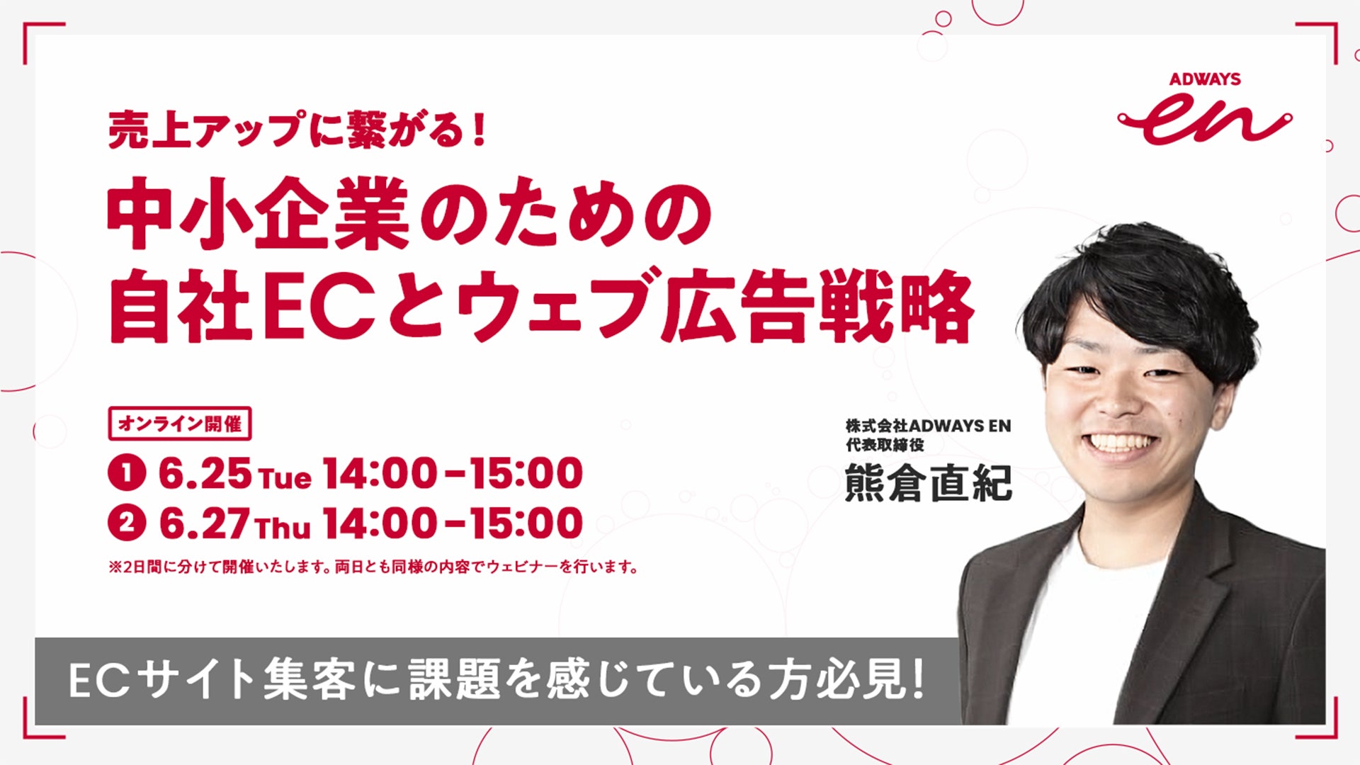 株式会社アドウェイズ(本社:東京都新宿区、代表取締役社長:山田 翔、以下アドウェイズ)の子会社である株式会社ADWAYS EN(本社:東京都新宿区、代表取締役社長:熊倉 直紀、以下ADWAYS EN)は、地方・中小企業向けデジタルマーケティング支援を目的とした「中小企業のための自社ECとウェブ広告戦略」ウェビナーを開催します。