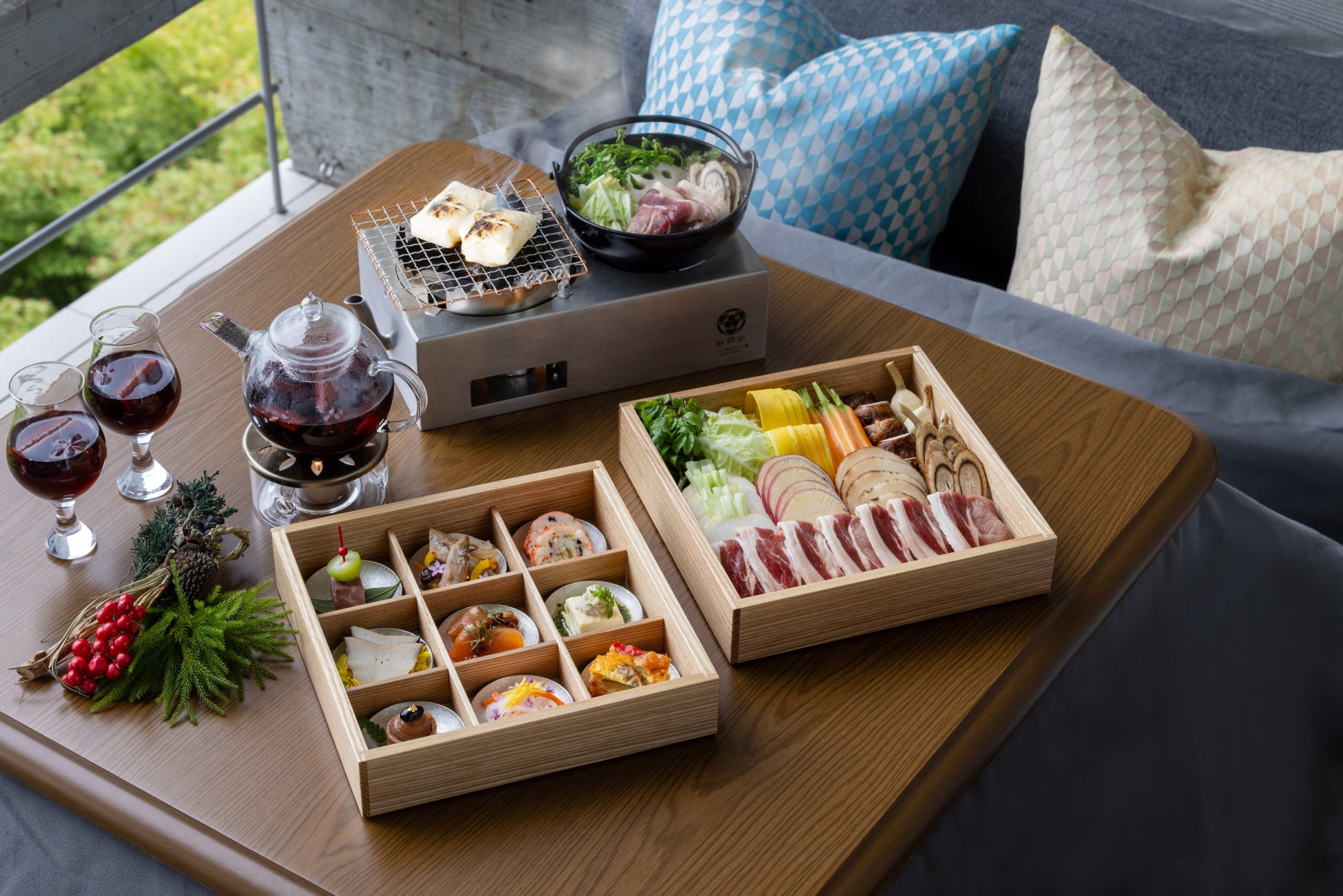 神社に参拝した後、河口湖を目の前に望む圧倒的なロケーションを誇るキャビンにて、開運朝食を味わいます。本朝食は、雄大な景色を眺めながら、縁起の良い食材や、山や川などから得られる土地の恵みをふんだんに味わい、活力を得る朝食です。例えば、食べると長く幸せな日々を送れるとされるごぼう、良い未来が見通せるとされる蓮根などの縁起の良い食材に、若桃やわかさぎ、煮鮑などの山梨県の特産品を組み合わせた料理を提供します。また、一緒に堪能するのは、山の恵である猪肉を昆布出汁で味わう開運鍋です。猪は子沢山であることと、栄養価が高く食べると万病を防ぐと言われることから、子孫繁栄、無病息災を象徴するとされています。さらに、飲み物には、無病長寿を願う屠蘇散(とそさん)を山梨県産の赤ワインと合わせた、お屠蘇ホットワインを楽しみます。豊かな自然の恵みと縁起の良い食材を使用した朝食を味わい、新たな一年を晴れやかに過ごす活力を得ます。