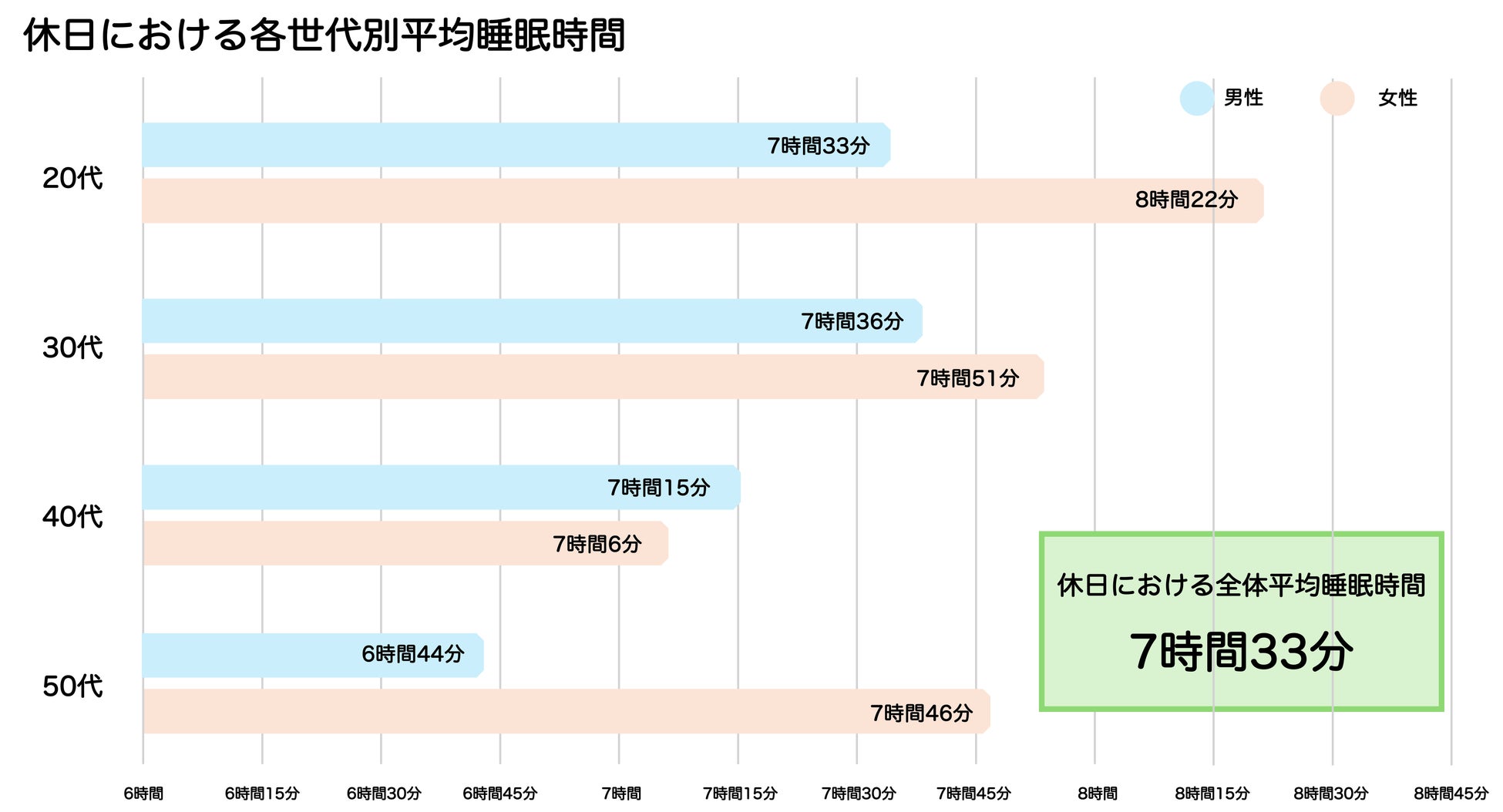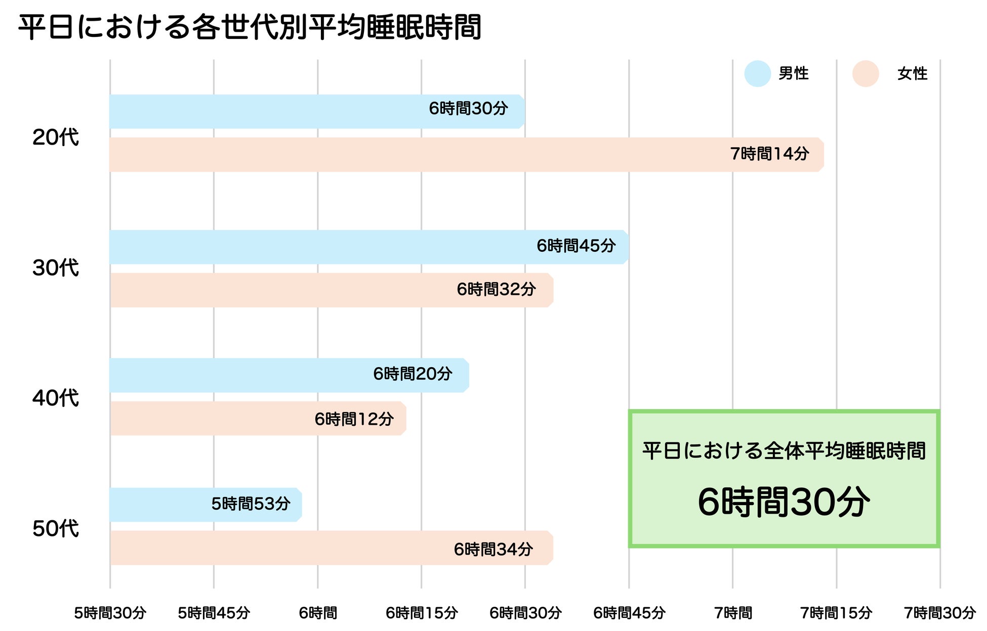 今回の調査結果から、日本人の平日における平均睡眠時間は「6時間30分」、休日の平均睡眠時間は「7時間33分」であることが分かりました。男女世代別における最も短い平日の平均睡眠時間では、50代の男性が5時間53分、40代の女性が6時間12分の結果となりました。