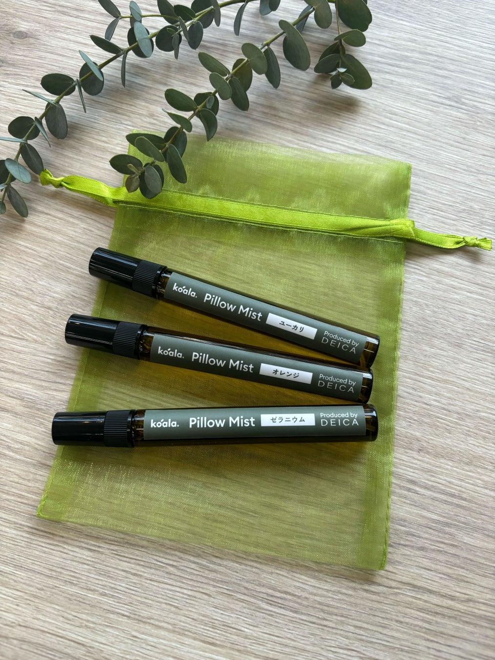2008年に誕生した日本のフレグランスブランド「DEICA」とのコラボで誕生した、オリジナルのピローミスト3本セットです。ナチュラル原料を使ったアロマで、優しく睡眠に導きます。ユーカリ、オレンジ、ベルガモットの3つの香り(各8mL)を、お好みで組み合わせてお使いいただけます。