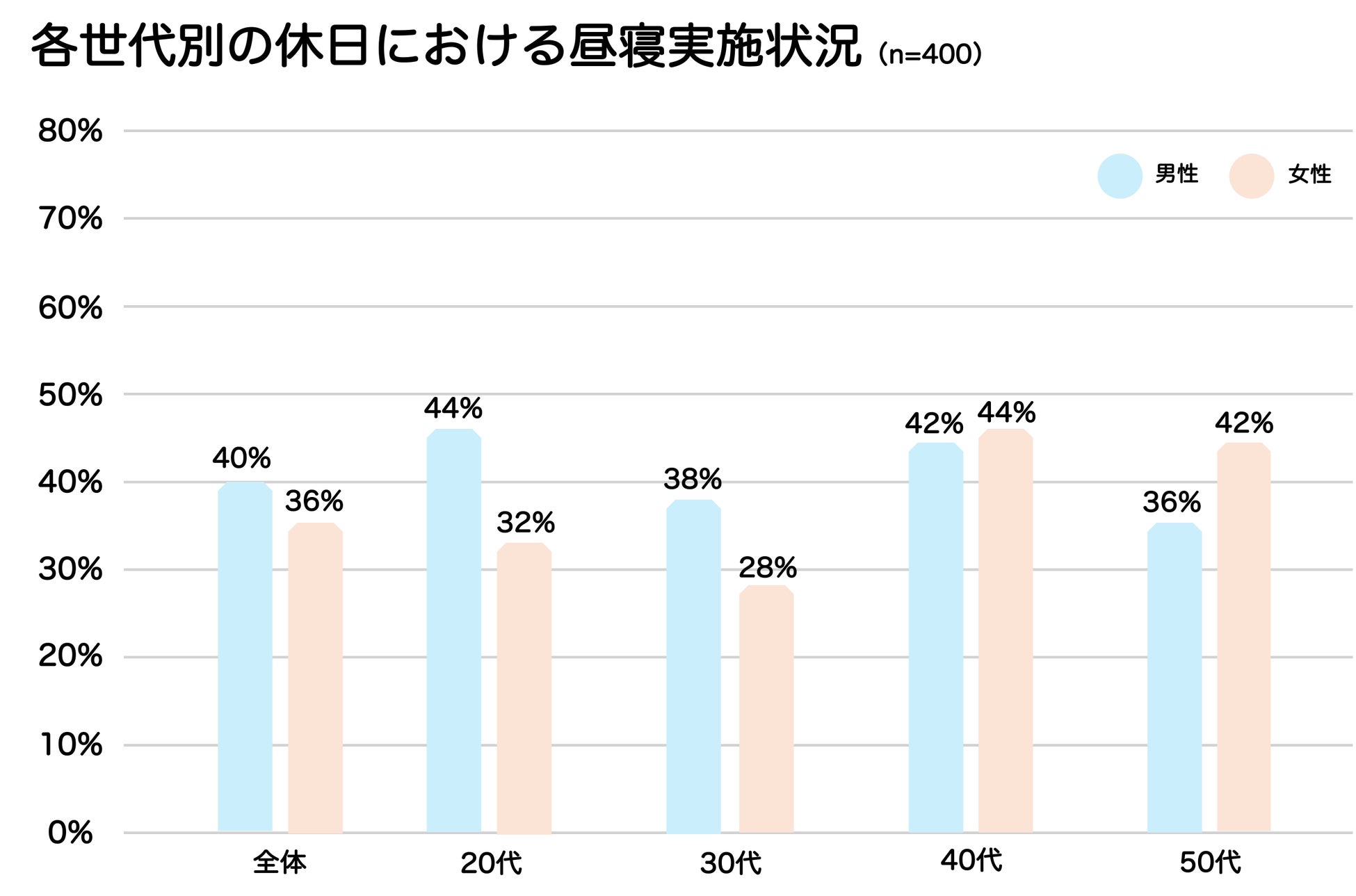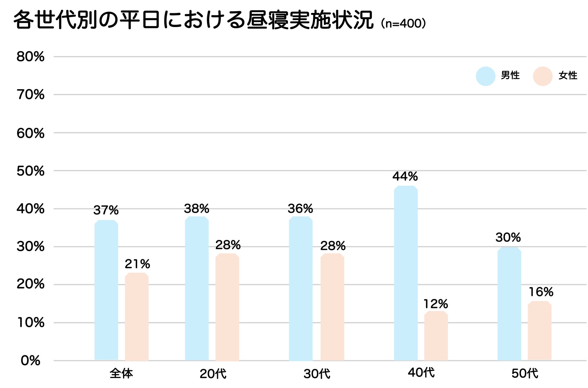 昼寝の実態については、全体の39%が「平日には昼寝を行っている」ことが分かりました。男女比では、男性は37%、女性は21%が昼寝を行っており、女性は男性に比べると昼寝を行っている方の比率が低い状況であることが分かりました。特に、40代・50代の女性の昼寝実施率は12%、16%となり、男女世代別において最も低い割合となりました。