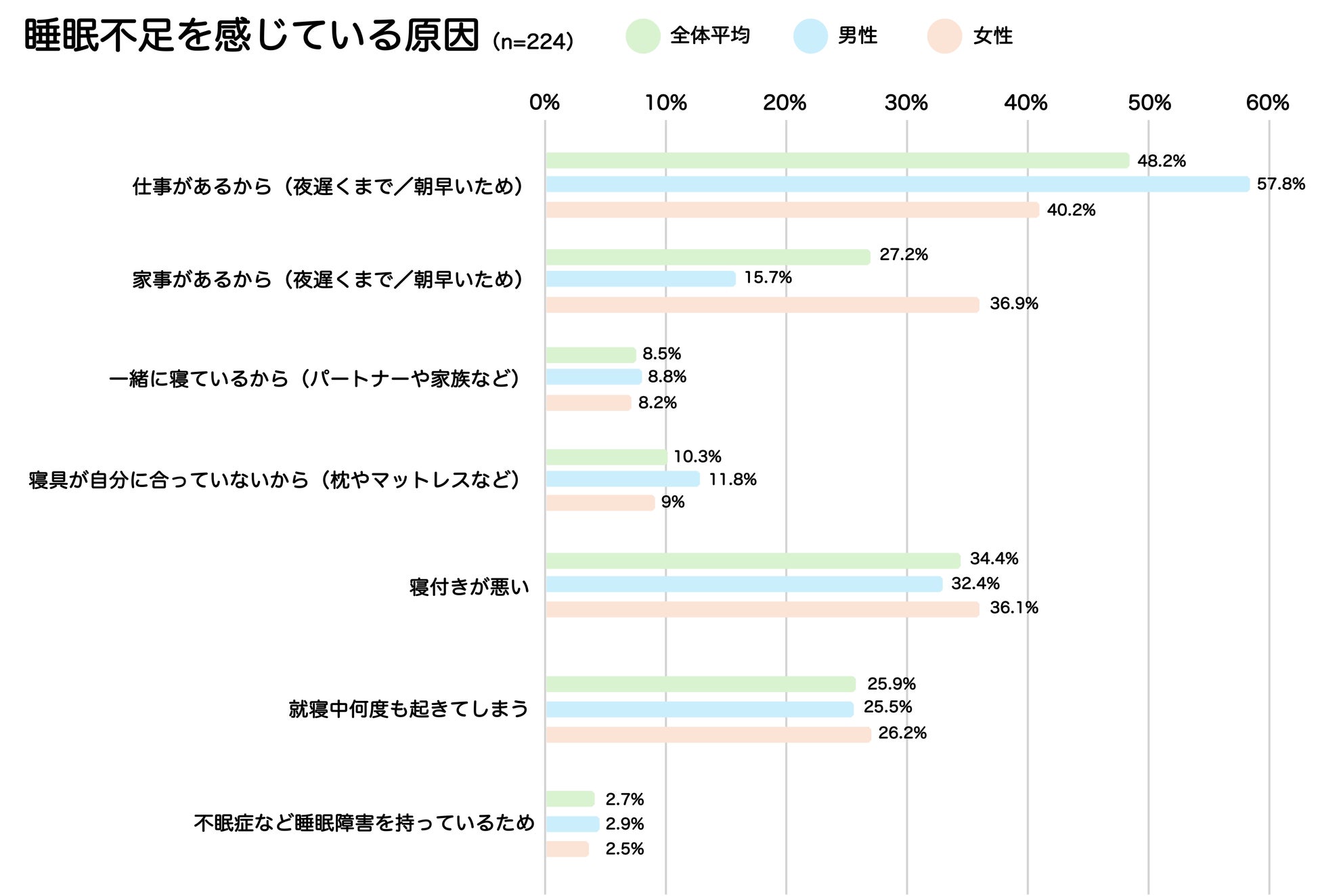 睡眠不足を感じる理由については、「仕事があるから(夜遅くまで/朝早いため)」が48.2%、「寝つきが悪いため」が34.4%、「家事があるから(夜遅くまで/朝早いため)」が27.2%という結果になりました。男女比較においては、女性全体の36.9%が家事によって睡眠不足を感じており(男性は15.7%)、特に40代の女性は47.2%の方が家事が原因で睡眠不足と感じていることが分かりました。なお、男性全体においては、仕事による睡眠不足を感じていると57.4%の方が回答しており、男性の2人1人が仕事が原因で睡眠不足を感じています。