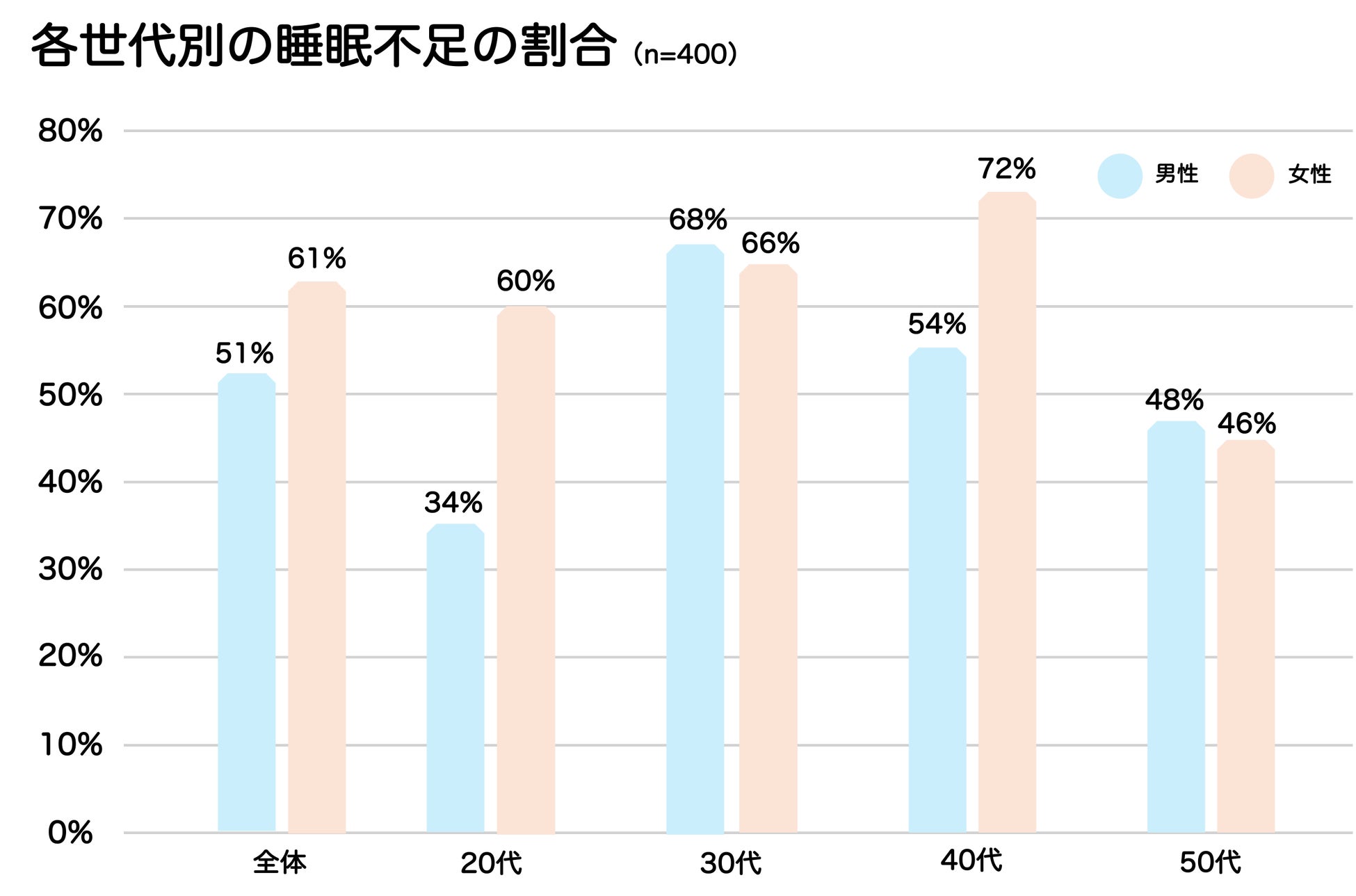 ・ 女性30代・40代は約70%が睡眠不足を感じており、全世代・性別中で最も睡眠不足が深刻