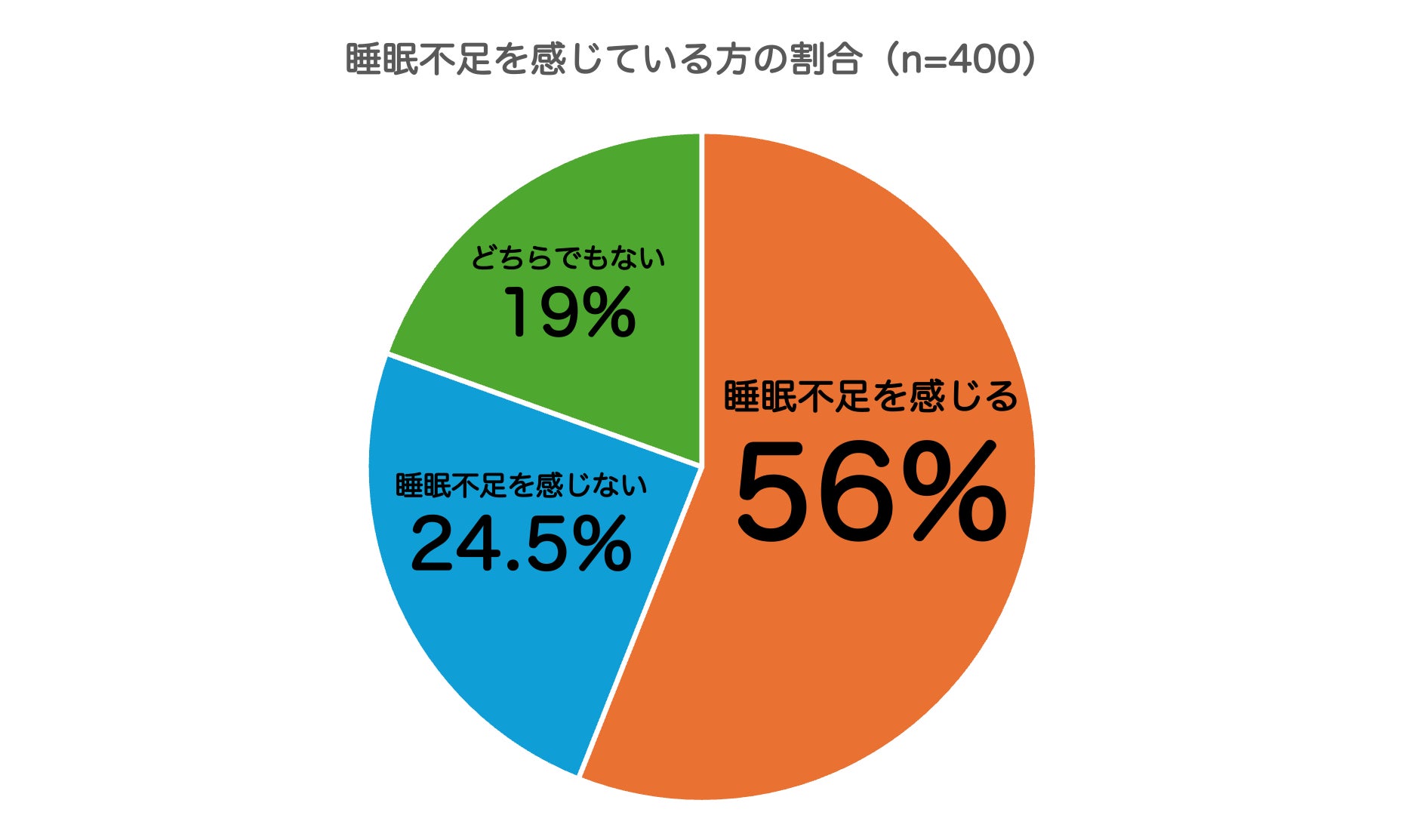 睡眠不足を感じている層は、全体の56%となり、2人に1人の方が「睡眠不足」を日々感じていることが分かりました。中でも女性の61%が「睡眠不足」を感じており、30代の女性は66%、40代の女性は72%の方が「睡眠不足」であることが分かりました。