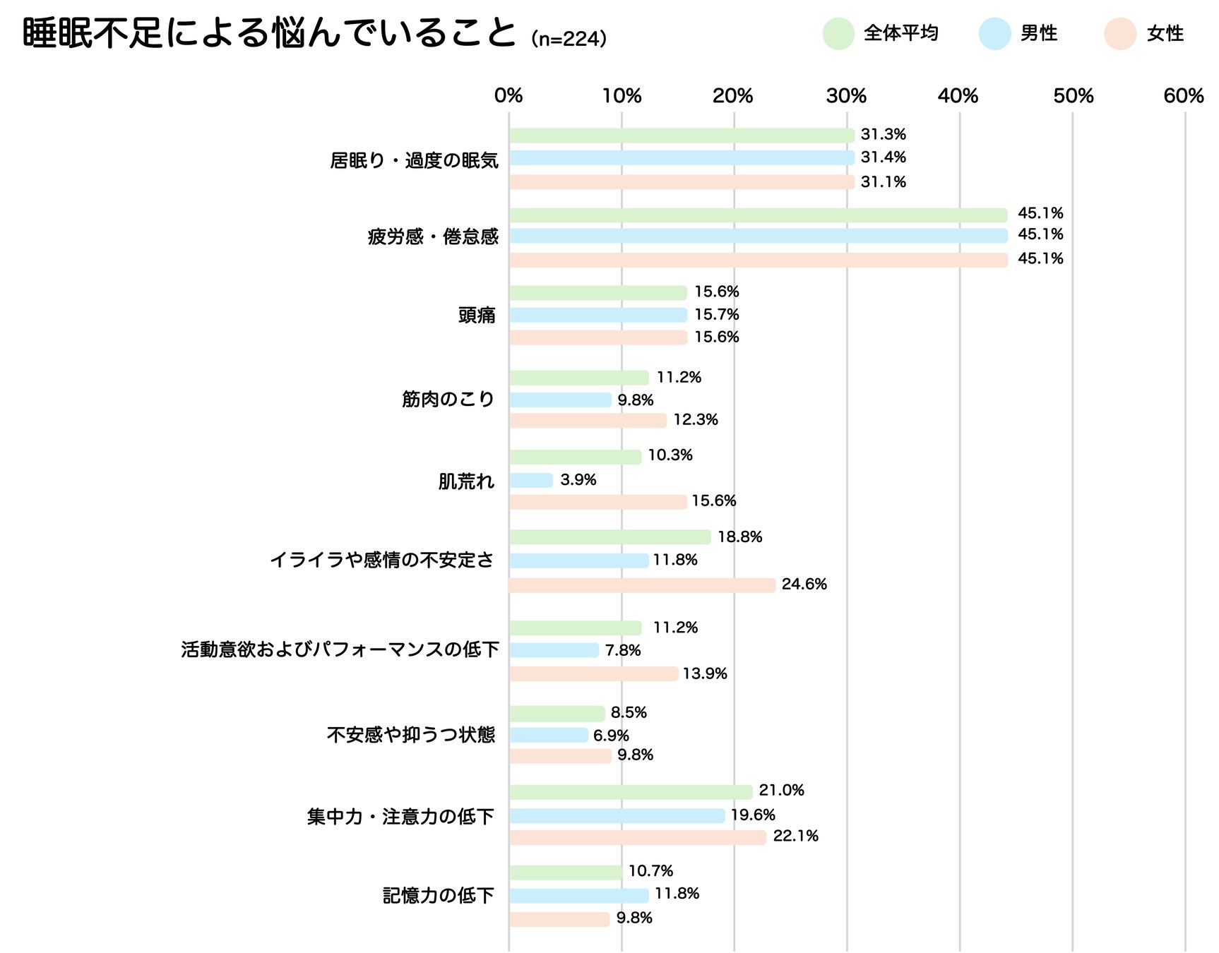 また、睡眠不足を感じる方の悩みを調査した結果、「イライラや感情の不安定さ」、「肌荒れ」、「集中力・注意力の低下」に悩む方が、男性よりも女性の方が多い傾向にあることが分かりました。