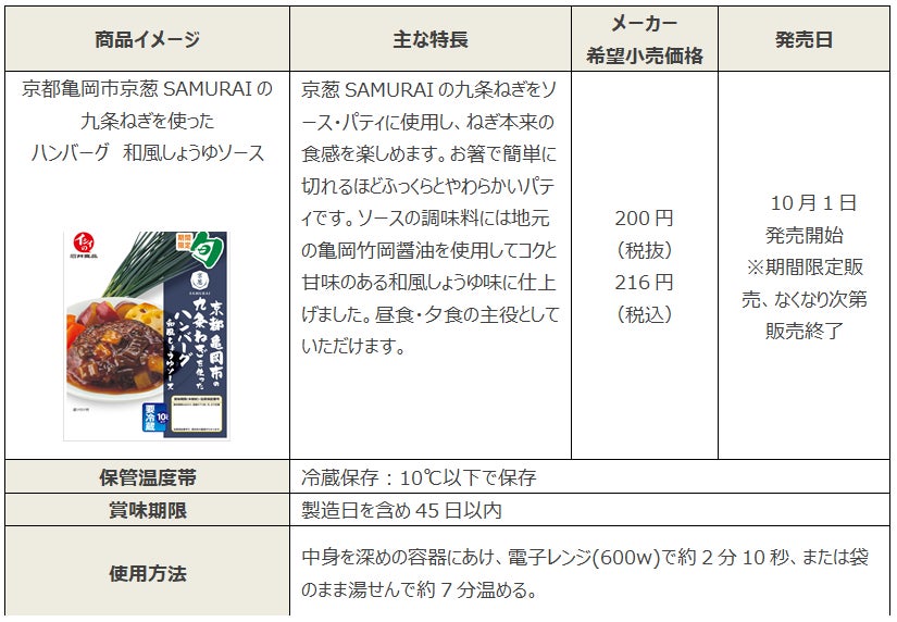 京都亀岡市より全国に京葱 SAMURAI の九条ねぎの魅力を発売 3 年目を迎える『京都亀岡市京葱 SAMURAI の九条ねぎを使ったハンバーグ和風しょうゆソース』を 10 月 1 日(日)から発売