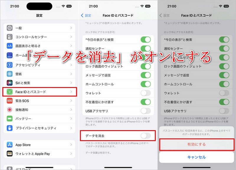 ただし、iPhone/iPadの設定の「Touch IDとパスコード」(またはFace IDとパスコード)の項目で、「データを消去」がオンになっていないと、この方法は利用できません。