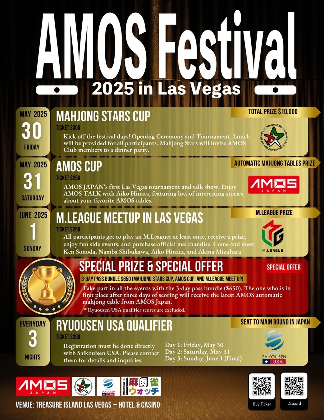 「AMOS FESTIVAL 2025 in LAS VEGAS」は、2025年5月30日から6月1日の3日間にわたって開催される大規模な麻雀大会です。Mリーグは、6月1日に「M.LEAGUE MEETUP in LAS VEGAS」を開催し、大会にはMリーガー4名が参加いたします。