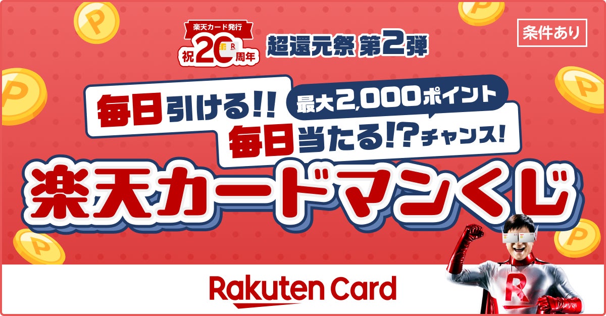 楽天カード株式会社(以下「当社」)は、2025年7月で「楽天カード」の発行から20周年を迎えたことを記念した取り組みの一環として、「毎日当たるチャンス!楽天カードマンくじ」(以下「本キャンペーン」)を本日2025年10月7日(火)から開催いたします。