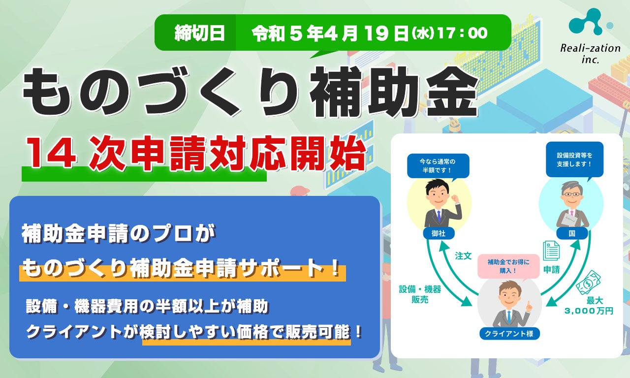 株式会社リアリゼイション(東京都渋谷区)は、「ものづくり補助金」の14次(締め切り:2023年4月19日(水) 17時)の申請代行サポートを開始!1年間申請し放題の「年間申請し放題プラン」も対応!