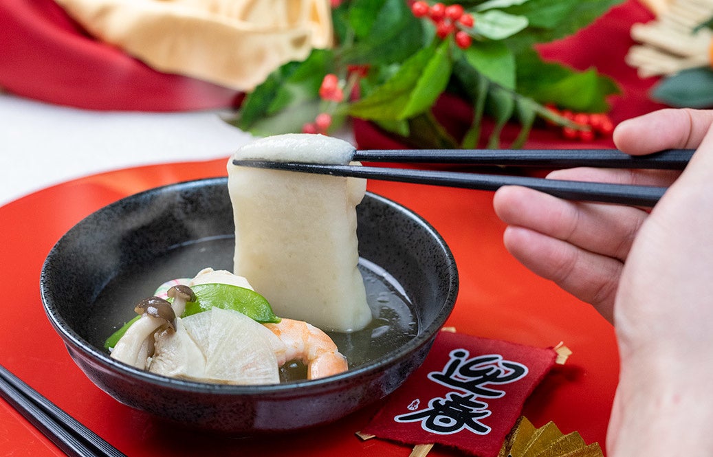 具材に、海老、比内地鶏、てまり麩、キヌサヤ、ぶなしめじ、大根を合わせました。関東風の「角餅」と関西風の「昆布だし」の東西折衷の本格的なお雑煮です。