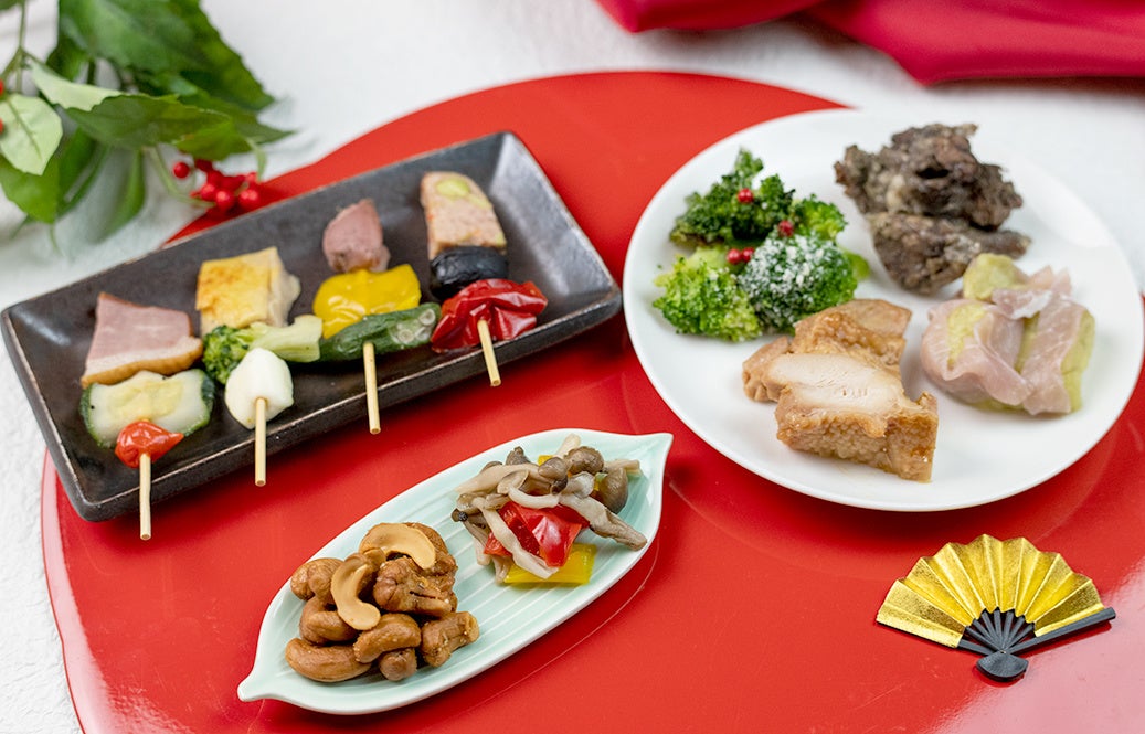 お雑煮(杵つき餅1個入り)・6種アラカルト・ピンチョス4本セット・2022年迎春干支クッキー 3枚入り・地卵はちみつぷりん・お好みのドリンクセット 3本入り・メニュー表