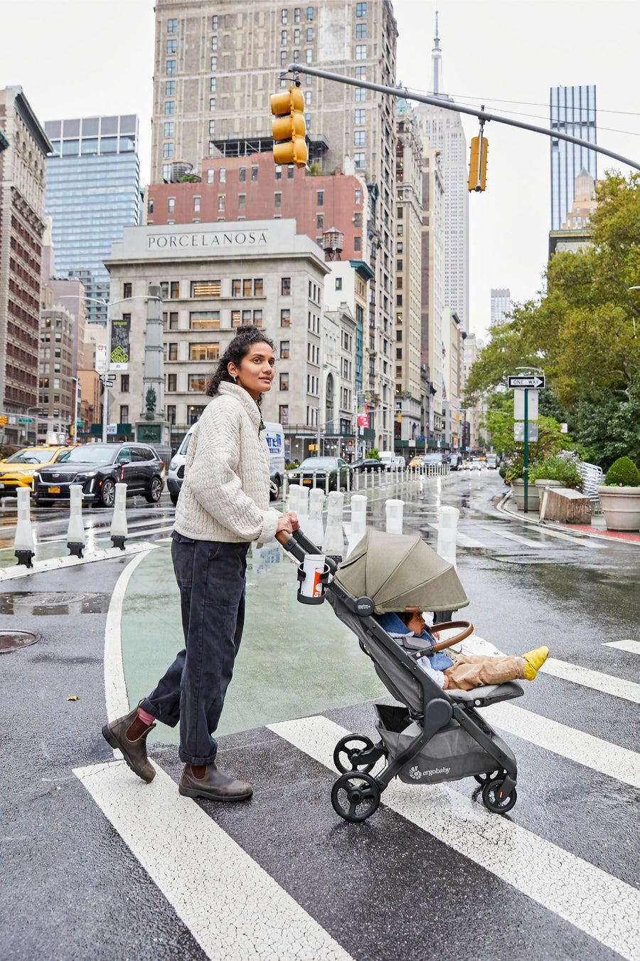 そこで、差し色として登場したのが「エンパイアステートグリーン」です。同ブランドの抱っこひもやバウンサーにおいてもモノトーンカラーに次いで、日本でも定評のあるグリーン系カラー。「エンパイアステートグリーン」は、トーンを抑えたグレイッシュな色味で、日々のコーディネートをやさしく彩りながら、汚れを気にせず使いやすい点が魅力です。ブラウンのレザー調のサポートバー、ハンドルがアクセントとなり、カジュアルシックな印象を与えます。親子のお出かけ気分を高める一台です。