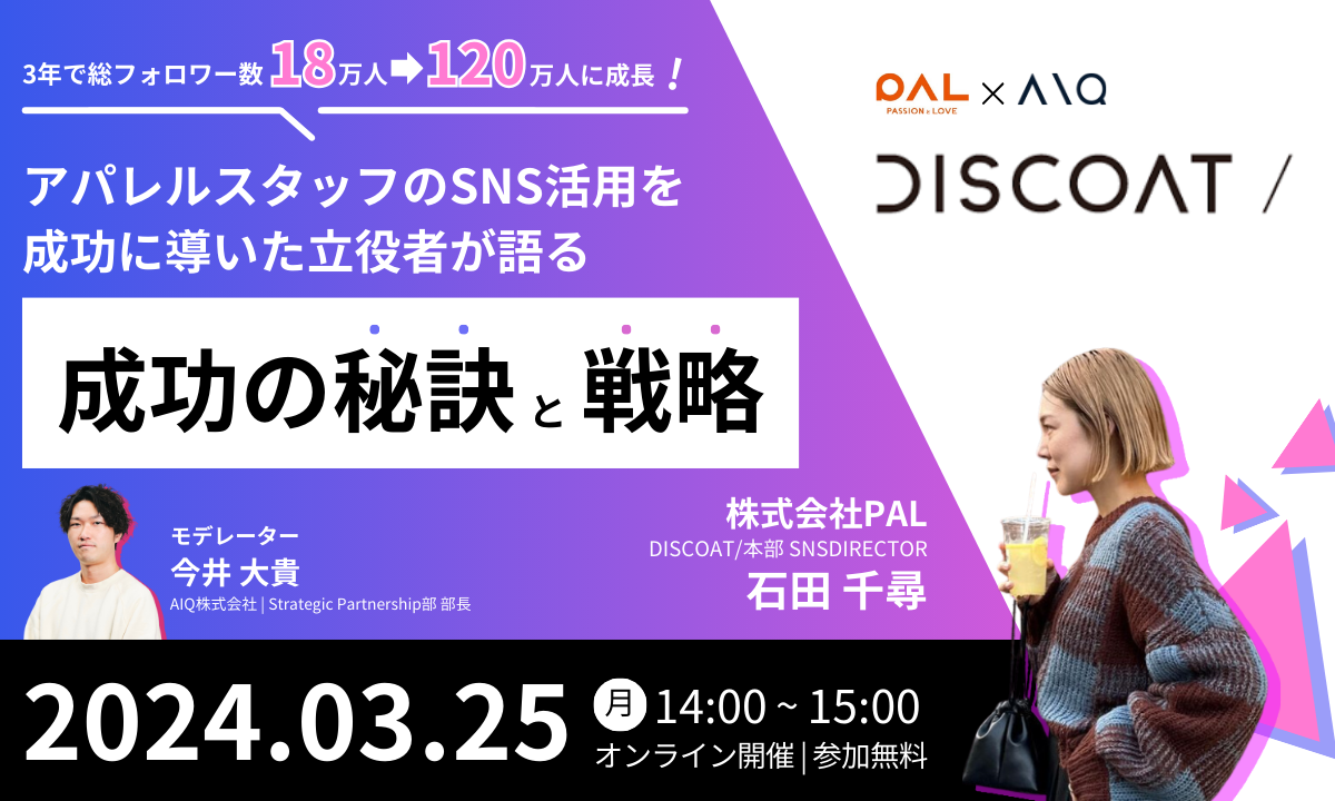株式会社パル”DISCOAT”アパレルスタッフのSNS活用を成功に導いた立役者が語る成功の秘訣公開セミナーをAIQ主催で開催!