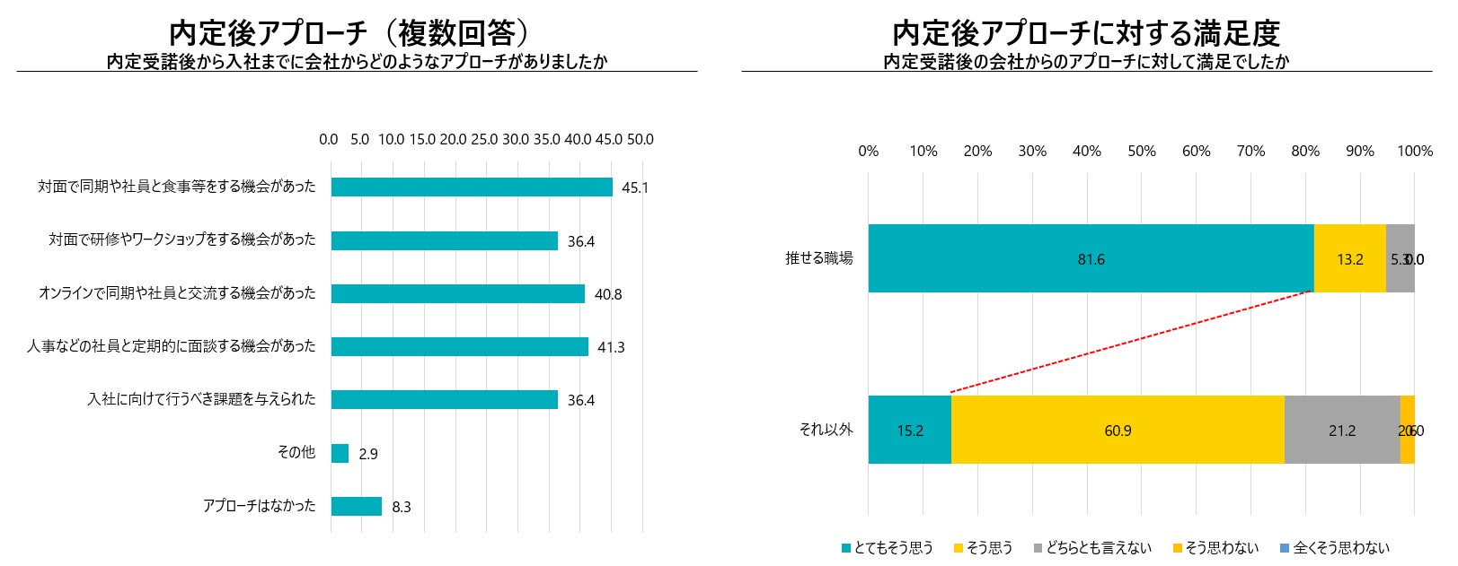 内定後のフォロー施策について、フォロー施策の満足度が「推せる職場」の評価に直結する。
