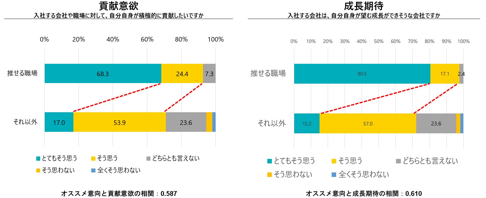 自ら選んだ企業が、「推せる職場」だととらえている新入社員は、「それ以外」だととらえている人に比べて積極的に職場に貢献したい割合が51.3ポイント高くなり、その組織で臨む成長が期待できるととらえている割合がそれ以外に比べて65.3ポイント高い結果となりました。