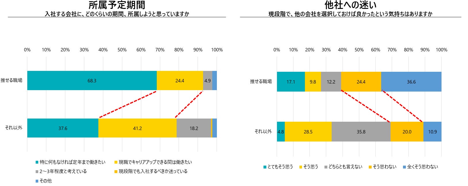 自ら選んだ企業が、「推せる職場」だととらえている人は、「それ以外」に比べて長く働きたい人が92.7%で、それ以外より13. 9ポイント高い結果となりました。また他社に対する迷いもない人が61.0%で、それ以外よりも30.1ポイント高く、迷いなく働いていこうとしているのが分かります。