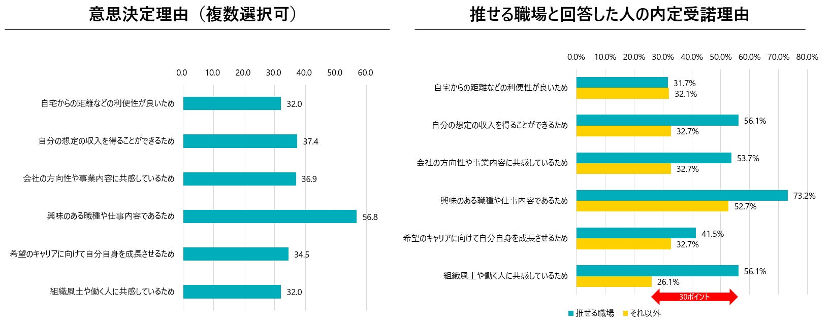 入社決定理由について、仕事内容だけでなく「組織風土や働いている人への共感」が影響している。