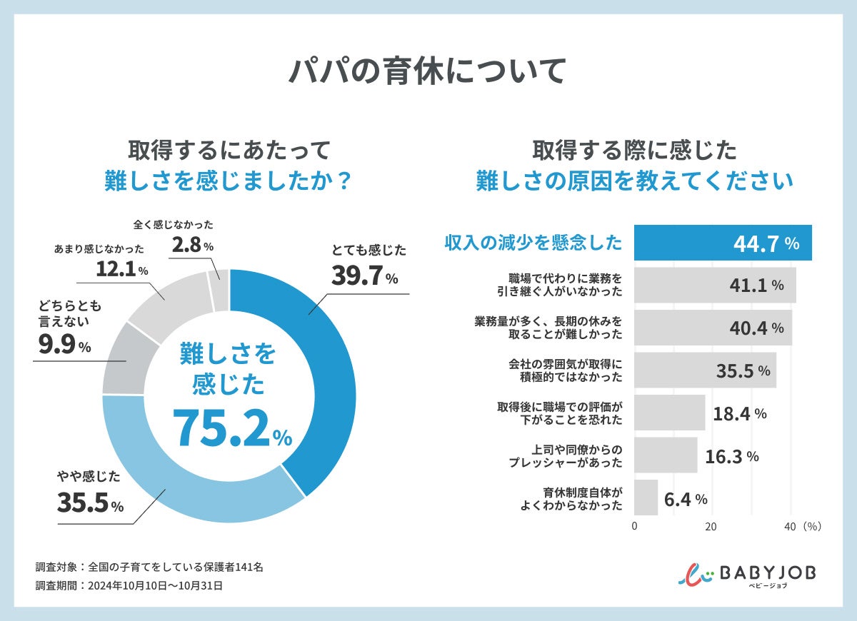 調査では、パパの育休取得の有無に関わらず、取得することが難しかったと回答した人は、7割を超える結果になりました。その理由として最も多かったのは、「収入の減少を懸念した(44.7%)」でした。次いで、「職場で代わりに業務を引き継ぐ人がいなかった(41.1%)」、「業務量が多く、長期の休みを取ることが難しかった(40.4%)」、という結果になりました。
