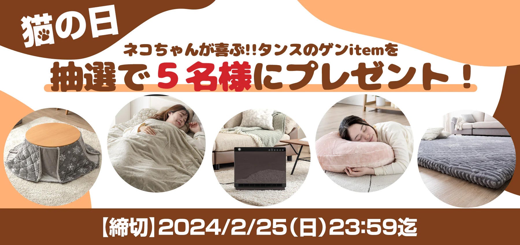 この「猫の日ニャンペーン」では、ネコちゃんだけでなく、飼い主の方々にも楽しんでニャッピーになっていただけるよう、人とネコちゃんが一緒に快適に使えるアイテムが抽選で5名様に当たるプレゼントキャンペーンをご用意しております。こたつやヒーター、ふわふわの毛布やクッション、ラグなどが景品となります。